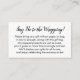 Se você estiver hospedando um chá de fraldas de exibição sem presentes para as novas mamães, neutro em gênero, este simples cartão poderia ser a escolha para você. Usando uma fonte bonito e moderna, eu adicionei primeiro um cabeçalho que anuncia a intenção de uma forma meio traiçoeira: "Diga Não ao Wrapping!" na frente, e "para" e "de" para o lado da etiqueta de presente. O campo de modelo foi criado para oferecer instruções aos convidados que não embrulhassem o seu presente; por favor, sintam-se livres para alterar a redação da forma que quiserem. Todas as fontes e cores podem ser modificadas conforme você vê o ajustado.