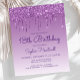 Este convite de aniversário 18 apresenta uma borda brilhante de faux glitter roxa e fundo ombre roxo. As palavras "18º Aniversário" e o nome do convidado de honra aparecem em um roteiro casual de escrita manual roxa, com o resto do texto personalizável na fonte sans serif. O mesmo design de gota a gota roxa aparece no verso.