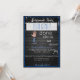 Convite de festas de Baixa de Microfone. Janto, bebidas, hotel, Rsvp. Fundo de madeira preta. Fonte azul e branca.