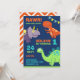 Surpreenda seus convidados com este convite de festas de primeiro aniversario legal com dinossauros coloridos brilhantes com tipografia vibrante sobre um fundo azul. Basta adicionar os detalhes do seu evento neste modelo fácil de usar para torná-lo um convite de tipo único. Sacudir a placa para revelar um padrão laranja elegante na parte traseira da placa.
