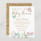 O tema da borboleta Whimsical é conduzido por convite de chá de fraldas, com borboletas cor-de-rosa e verde-menta com brilho de ouro falso. Há um jardim de flores no fundo. Este convite é perfeito para um chá de fraldas feminino durante a pandemia, mantendo o distanciamento social. Esta placa é menor que a placa de convite padrão no zazzle, e a opção de alterar a forma e o tipo do papel não está disponível. É uma opção amigável ao orçamento!