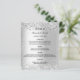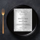 Um cartão de cardápio de casamento elegante e glamouroso. Personalize e adicione seus nomes, data e menu de casamento. Fundo metálico de aspecto fino prateado, decorado com faíscas de brilho.