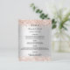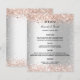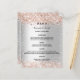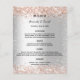 Um cartão de cardápio de casamento elegante e glamouroso. Personalize e adicione seus nomes, data e menu de casamento. Fundo de aspecto fino prateado, decorado com faíscas rosa douradas.