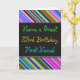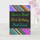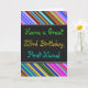 Esta design de cartão de saudação divertida, colorida e caprichosa, com tema de aniversário, apresenta um desejo de aniversário caloroso como "Tenha um Excelente 23º Aniversário, Nome!" na frente. O nome na frente pode ser personalizado. A parte superior e inferior da parte frontal contém faixas vibrantes e multicoloridas. O dentro apresenta uma mensagem de aniversário personalizável. Um cartão de boas-vindas como este poderia ser uma maneira divertida de fazer votos de aniversário a alguém que comemora seus vinte e três anos. [~Z0000269]