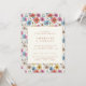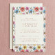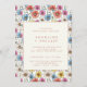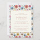 Apresentando uma vibrante borda de aquarela de flores silvestres desenhadas à mão em tons de azul, coral, amarelo e rosa-pincel. O design rodeia um centro ninho nítido onde os detalhes do evento são mostrados em fontes serif modernas. O layout desajeitado e o humilde motif floral misturam sofisticação contemporânea com encanto romântico, fazer deste convite ideal para comemorações de primavera, verão, jardim ou temas boêmicos. A parte traseira permanece limpa para mais detalhes ou uma nota pessoal, garantindo que seu anúncio seja alegre e eterno.