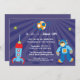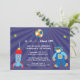 O convite de aniversário deste garoto 5 horas por dia, 7 dias por semana tem um tema de foguete espacial. Há um foguete voando e um astronauta com uma lua e estrelas flutuando ao redor. Você pode personalizar isso facilmente com as informações de sua parte no meio. Gráficos por Blackleaf Studios no MyGrafico