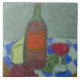 Uma garrafa do vinho tinto senta-se em um tablecloth azul e branco do tabuleiro de damas nesta vida do impressionista ainda. Cercando a garrafa de vidro verde seja grupos de uvas vermelhas e brancas, de uma cunha de queijo e de um vidro claro enchido com o vinho tinto. Aperfeiçoe como um trivet ou apenas para a decoração da cozinha. De minha imagem digital criada do original.