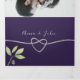 Elegante convite de casamento com caligrafia moderna, folhagem em aquarela roxa com coração de corda falsa prateada simples e foto personalizada do casal.
