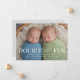 Mostre seus gêmeos recém-nascidos com nossos cartões de anúncio de nascimento "Double The Fun". Os cartões de anúncio de nascimento exibem sua foto favorita dos gêmeos com "Double The Fun" em um estilo de tipografia moderno. O verso apresenta um design de triângulo cinza e branco personalizável. Personalize os anúncios adicionando os nomes deles, detalhes do nascimento e uma mensagem especial na parte inferior para um lindo anúncio de nascimento que seus amigos e familiares irão guardar com carinho.