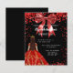 Um convite moderno, na moda e glamouroso para uma doce festa de aniversário 16, 16. Um fundo preto com brilhos, um vestido vermelho e um arco vermelho. O nome é escrito com um moderno estilo escrito à mão. Personalize e adicione os detalhes da sua festa. 1 folha = 1 convite impresso de borda a borda.