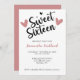 Doce 16 Cardíacos Convite de Aniversário. Junte-se a nós para uma comemoração mágica do Sweet 16. Os hóspedes vão divertir-se, deliciosos doces, e dançar à noite, sob luzes de fadas brilhantes. Adorem sua celebração com decorações em forma de coração e um incrível bolo de aniversário rosa e branco.