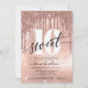 Moderno, moderno 16º convite de aniversário. Design apresenta gotas de glitter rosa dourado, folha falsa e fundo brilhante, número 16 em letras brancas de tendência, script de tipografia doce 16 e detalhes da festa.