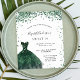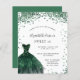 Um convite moderno, na moda e glamouroso para uma doce festa de aniversário 16, 16. Na frente: Um fundo branco com brilhos verdes, um vestido verde esmeralda. O nome é escrito com um moderno estilo escrito à mão. Personalize e adicione os detalhes da sua festa.