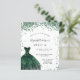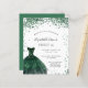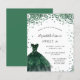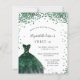 Um convite moderno, na moda e glamouroso para uma doce festa de aniversário 16, 16. Na frente: Um fundo branco com brilhos verdes, um vestido verde esmeralda. O nome é escrito com um moderno estilo escrito à mão. Personalize e adicione os detalhes da sua festa.