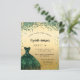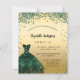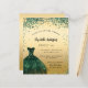 Um convite moderno, na moda e glamouroso para uma doce festa de aniversário 16, 16. Na frente: Um fundo de ouro falso com um confete verde, um vestido verde esmeralda. O nome é escrito com um moderno estilo escrito à mão. Personalize e adicione os detalhes da sua festa. 1 folha = 1 convite impresso de borda a borda.