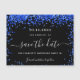 Um fundo preto decorado com confete azul real. Personalize e adicione uma data e nome/idade. O texto: Salvar a Data é gravado com um script de estilo com letra de tendência grande.