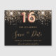 Uma Imã salve a data de moda e moda para uma doce 16, 16ª festa de aniversário. Um fundo preto decorado com falso brilho dourado. Modelos de uma data, nome e texto. Letras coloridas com ouro. O texto: Salvar a Data é gravado com um script de estilo com letra de tendência grande.