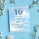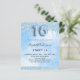 Um convite moderno, na moda e glamouroso para uma festa de aniversário Doce 16, 16. Um céu branco e azul claro como fundo com brilho azul claro, pingado de tinta pingando. O nome é escrito com um moderno script de estilo escrito à mão preto. Personalize e adicione os detalhes da sua festa. O número 16 é escrito com uma fonte de estilo de balão, script.