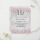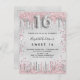Um convite moderno, na moda e glamouroso para uma festa de aniversário Doce 16, 16. Um fundo de aspecto fino prateado, decorado com pó brilhante de prata rosa e falso. Personalize e adicione o seu nome e detalhes da festa. O número 16 é escrito com uma fonte de estilo de balão, script. Fundo: fundo falso prateado, design postal. Dica: Se você não quiser que pareça um cartão postal, clique em personalizar, vá para o verso e remova o divisor e o carimbo de posto.