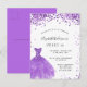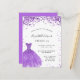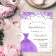 Um convite moderno, na moda e glamouroso para uma doce festa de aniversário 16, 16. Na frente: Um fundo branco com violeta, brilhos lilás, um vestido violeta. O nome é escrito com um moderno estilo escrito à mão. Personalize e adicione os detalhes da sua festa.