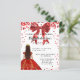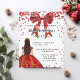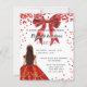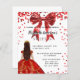 Um convite moderno, na moda e glamouroso para uma doce festa de aniversário 16, 16. Um fundo branco com confete, um vestido vermelho e um arco vermelho. O nome é escrito com um moderno estilo escrito à mão. Personalize e adicione os detalhes da sua festa. 1 folha = 1 convite impresso de borda a borda.