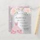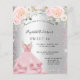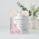 Um convite moderno, na moda e glamouroso para uma doce festa de aniversário 16, 16. Um fundo metálico prateado sujo com brilho sujo rosa, faíscas, um vestido e flores cor-de-rosa pinceladas. O nome é escrito com um moderno estilo escrito à mão. Personalize e adicione os detalhes da sua festa.
