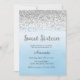 Doce convite de dezesseis aniversários com design do brilho da prata do falso e fundo azul da aguarela do ombre.