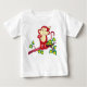 Esta camisa adorável de bebê apresenta um macaco vermelho com uma cauda longa e coalhada em um galho de árvore cercado por folhas verdes.