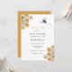 Convite para chá de fraldas, com tema de abelhas, honrando a mamãe! A design apresenta pentes de mel amarelas e douradas com uma ilustração de abelha. Personalize com suas informações ou clique em "Clique para personalizar mais" para editar estilos de fonte, tamanho e cores.