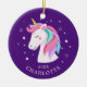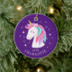 Personalize e Date Enfeites de natal de unicórnio Cute apresentando um doce unicórnio com um azul turquesa, rosa e roxo e enquadrado com flores delicadas colocadas sobre um fundo roxo escuro.