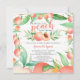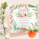O doce pêssego está no caminho do convite do chá de fraldas com uma moldura de pêssego e folha verde adornada com brilho dourado espalhado. Visite nosso compro para ver nossa doce coleção de design de pêssego.