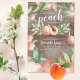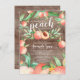 Pessegueiro doce está no caminho do convite para chá de fraldas com uma moldura de pessegueira e folha verde em um fundo de madeira rústica. Visite nosso compro para ver nossa doce coleção de design de pêssego.