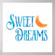 Este poster de inspiração e motivação seria excelente para um quarto, quarto de crianças ou berçário. Ele apresenta uma lua laranja com efeito de aquarela. No texto lê-se "Doces Sonhos" com um efeito de aquarela azul.
