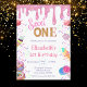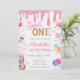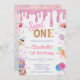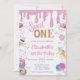 Adoráveis borrifos cor-de-rosa, doce convite para um primeiro aniversario para uma menina. Lólipops bonitos, sorvete de fusão doce e muito mais!