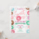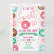 Este é um Chá de fraldas Convidado com um tema de rosquinha e borrifar. A design é constituída por rosquinhas com glacés de chocolate azul, rosa, roxo, verde e castanho e aspersores. Um Pouco Doce Está A Caminho!