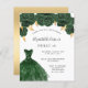 Um convite moderno, na moda e glamouroso para uma doce festa de aniversário 16, 16. Na frente: Um fundo branco com poeira brilhante verde, um vestido verde esmeralda e rosas verdes, florais. O nome é escrito com um moderno estilo escrito à mão. Personalize e adicione os detalhes da sua festa. Fundo: fundo de ouro falso.