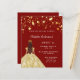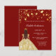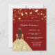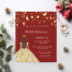 Um fundo vermelho. Decorado com estrelas ouros e uma garota vestindo uma tiara e um vestido de ouro. Personalize e adicione um nome e detalhes. 1 folha = 1 convite impresso de borda a borda.