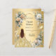 Um fundo com aspecto de ouro. Decorados com os florais brancos e amarelos e uma fita de ouro. Uma garota vestindo uma tiara e um vestido. Personalize e adicione um nome e detalhes. 1 folha = 1 convite impresso de borda a borda.