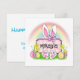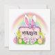 Este design de querido apresenta um arco-íris, um sinal de nome de gingham, orelhas e pés coelhos, narciso e ovos de Páscoa. Saudação de "Felz pascoa" no lado de trás. Personalize frente e trás conforme desejado.