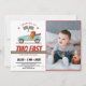 Dois Convite de Aniversário de Carro Rápido com Foto faz parte da coleção Race Car Birthday. Este produto tem carro de corrida, bandeiras controladas, animais. Feito principalmente em cores azul e vermelha com fontes decorativas. Explore mais produtos correspondentes em nossa loja.