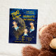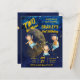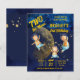 Dois da festa do segundo aniversário da Lua convidam modelo com um ursinho engraçado fofo em um capacete espacial e calças voando no espaço no céu celeste com ouro metade da lua ao fundo.
