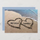 Linda e original fotografia profissional de dois corações escritos na areia ao longo da água azul do oceano para significar amor e romance. Insira facilmente o nome da noiva e noiva nos corações, como mostrado. Os nomes de exemplo são escritos no estilo de fonte e cor perfeitamente correspondentes, que também podem ser alterados facilmente. Coloque seu texto personalizado e detalhes e informações na parte traseira do convite ou deixe o vazio se desejar. Conceito de excelente para noivados de verão, casamentos, aniversários e salvamento dos convites e anúncios de data para o casal feliz.