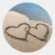 Lindos adesivos e selos de envelope com uma foto original de dois corações escritos na areia ao longo da água azul do oceano para significar amor e romance. Conceito de excelente para os próximos casamentos de verão.