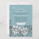 Um design floral ocasional que caracteriza dois margarida-como as flores cercadas swirly pela folha com um azul no fundo azul. Um convite à moda, moderno.