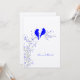 Este convite colorido do casamento de Kustom By Kris apresenta um par de pássaros lacrimogêneos brilhantes salpicados em um galho prateado com amoras azuis e prateadas reais. Os nomes da noiva e do noivo são impressos na frente com os detalhes completos do evento impressos no verso.