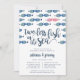 Nossos convites para o janto de ensaio de verão na costa mostram uma escola de peixes em tons de azul, com um beijo de peixe em cor-de-rosa contrastante. "Dois peixes a menos no mar" aparece em letras de caligrafia, com seu ensaio de cerimônia e detalhes de janto ou celebração embaixo.