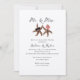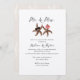 Convite para chá de casamento de casal de peixe estrelado vestido. Um noivo de estrelas-do-mar com bolacha, e noiva de estrelas-do-mar com coroa floral, é o design com letra preta de escrita. "Sr. e Sra." no topo e nomes da noiva e noiva em impressão maior. O reverso é bronzeado com padrão de estrelas.