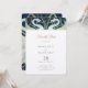 Este cartão Save the Date incorpora o romance eterno da era Art Deco, apresentando um par de golpes elegantes colocados contra um pano de fundo de luxuosos azuis escuros e de motivos florais opulentes. Os cisnes são ilustrados de forma estilizada com delicados sotaques dourados, evocando um senso de beleza e graça clássicas. O uso de tons pastéis no texto, aliados ao marinho e à paleta dourada, cria um ar de sofisticação e luxo sereno. O convite é gostosamente adornado com uma fonte subestimada que complementa o design ornamentado, perfeito para anunciar suas núpcias futuras com um toque de glamour vintage.