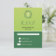 Cartão RSVP de folhagem botânica Primavera verde de dois tons, com verde limão verde e fundo verde florestal e uma coroa circular em torno de uma cruz cristã esbranquiçada. Todo texto é personalizável e a coroa e o motivo cruzado também aparecem no sentido inverso.