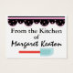 Usando cartões de visitas (alguns regulares e alguns gordinhos), estou projetando cartas que sempre gostei de ter na mão: 1. Cartões de presentes para prender presentes ou cestos de presentes, e 2. "DA COZINHA DE" para fazer o mesmo quando você dá a alguém algo especial de sua cozinha. São ambos um toque de classe, e sempre tive comentários simpáticos nas cartas dos meus destinatários. Antes da Zazzle, eu os encomendava a uma empresa muito cara. Eu até encaro uma foca com meu monograma para ir ao tecido ou plástico. Ficarei feliz em te dizer onde consegui isso. A maneira que vejo é que se eu vou dar um belo presente ou passar tempo cozinhando, vale a pena embrulhá-lo com um toque especial, então... divirta-se com ele! Verifique os diferentes estoques de papel para sua preferência e preço! Obrigados, Sharon Rhea Ford (www.zazzle.com/sharonrhea*)